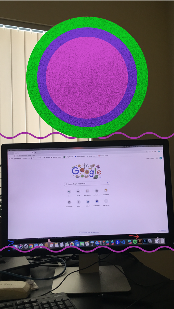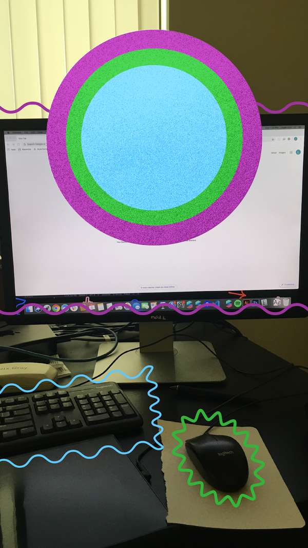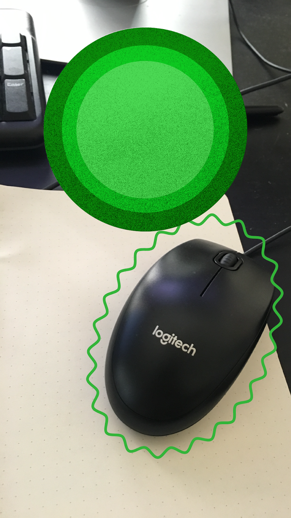 Once an object is detected, a colorful wiggle spins around it and emits a tone, while the circle at the top of the screen pulses with a corresponding color. As the user adds more objects, new colors emanate from the object and we hear a different tone, creating a prismatic, atmospheric soundscape based sheerly on the number of objects the user scans.