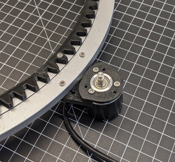 Enter the rotary encoder. We designed and 3D printed some meshing spur gears and connected it to our wheel in a 4.5:1 gearing. Our encoder pulses 600 times per revolution, and with our gearing it gave us accuracy down to 0.133 of a degree. Together with a wired connection, we finally got the accuracy and speed we wanted.
