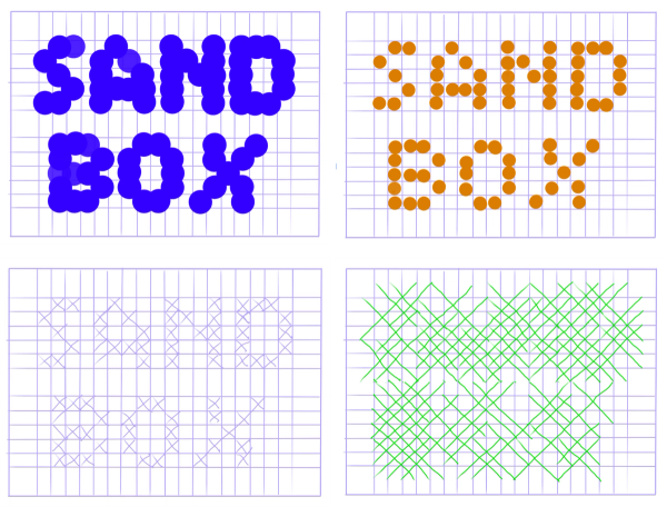Our final logo is comprised of squares and stars that can be distorted. The latter is mapped to the current day and time to give it a life of its own, setting up a routine of identity transformation for whenever we release a Sandbox post.