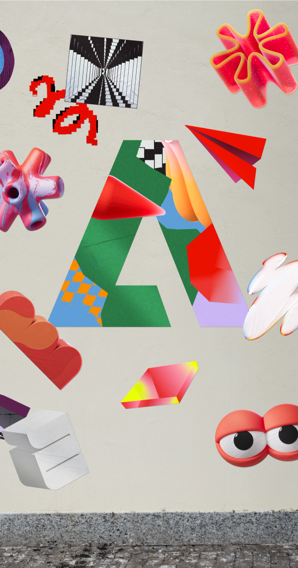 Our shape library is a collection of over 50 graphic elements that showcase the opportunities of Adobe Creative Cloud, as well as the creatives using it. With visual styles across 2D, 3D, gritty, soft, and structural shapes, it's a playground for limitless creative exploration, amplifying the theme of play at Adobe MAX.
