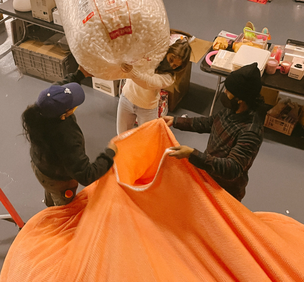 We wanted this particular decoration to be constructed with a fuzzy material, so we sourced the fabric and handed it over to a seamstress. For the sewing pattern we adapted to a template using a projector, and had to brush up on our high school math equations.