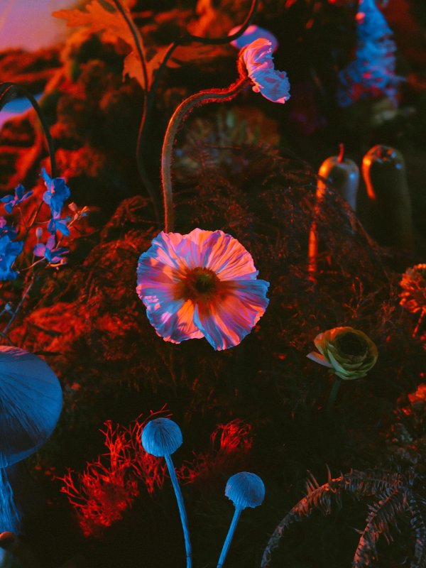 We wanted to take the garden to a new dimension of magical, so we carefully considered ways of maximizing the scale and whimsy of the environment. To enhance the ethereal appearance we needed real greenery, so we brought in an entire van full of living plants. To top it all off we had brilliant paper artist, Ben Kress, create bespoke, larger than life mushrooms and poppies.