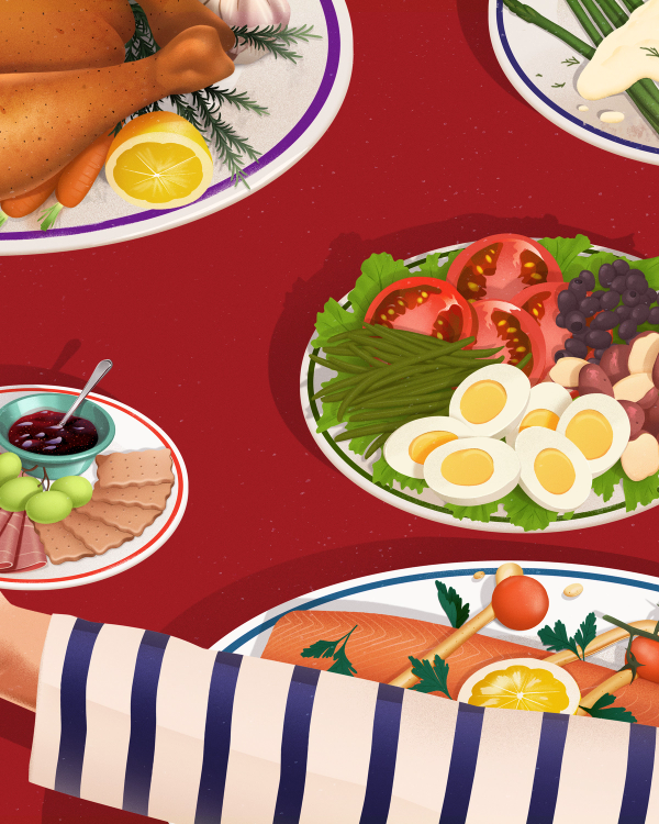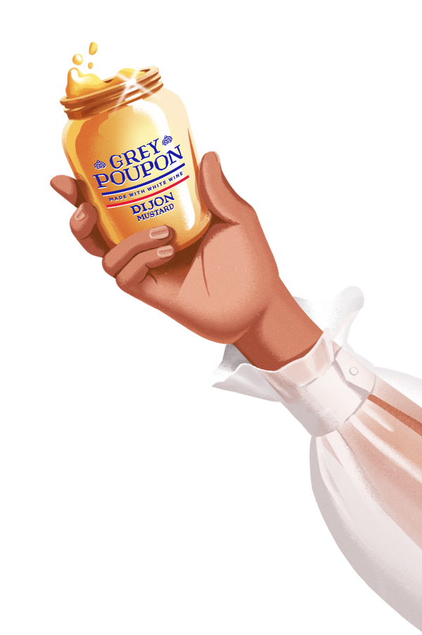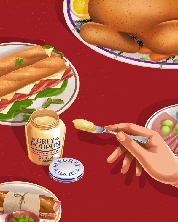 This was Grey Poupon’s first foray into the world of illustration so we wanted to make sure the product was front and center. Around the mustard-y goodness, we created a spread fit for kings and queens. While nodding at the composition of the propaganda style, we steered clear of anything overtly guillotine-y, instead leaning on shadows, light, textures, and exaggerated angles as our core principles.