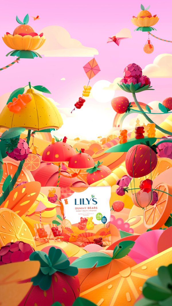 After the success of our previous work for Lily’s Chocolate Almonds, Hershey’s wanted us to build upon the same world but for a different product — Lily’s Gummy Bears. We had a blast showing our adorable bear buddies how to live their best lives in a colorful, fruity, paper world.