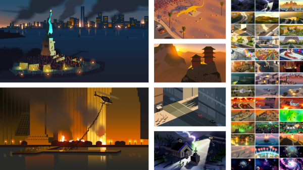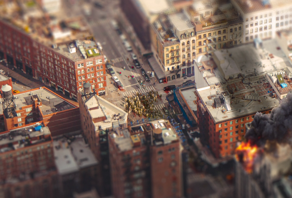 Early on, there were talks of a stylized look, or even building practical miniature sets, but it was important for us that this felt like you were watching a real world (albeit bite-sized) apocalypse happen right before your eyes. With this idea in mind we arrived at the decision to use a mix of cg and live action photography treated with a tilt shift effect.