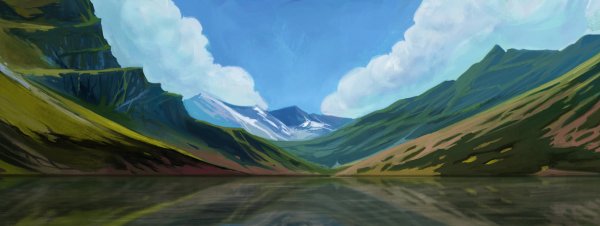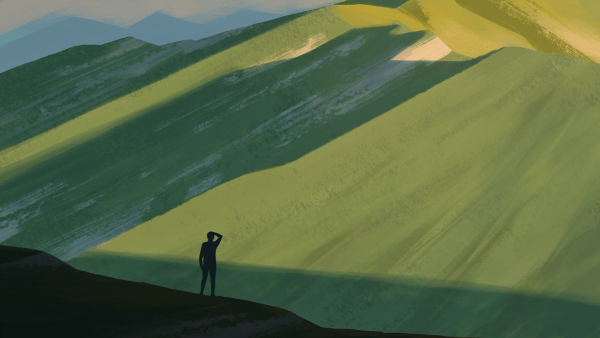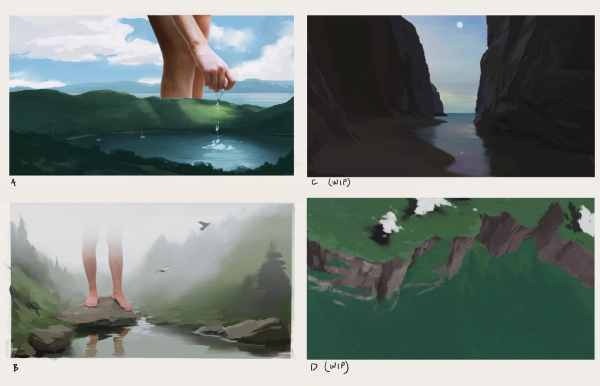 Our starting point was loose painting exploration —playing with ways to integrate humans and objects in natural landscapes in a way that pushed scale, lighting and saturation.