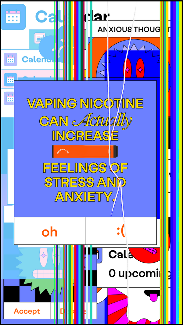 For the Waterfall spot, we used a glitch animation style in moments to communicate that feeling where one too many vapes cause your energy and stress level to get a bit crispy.