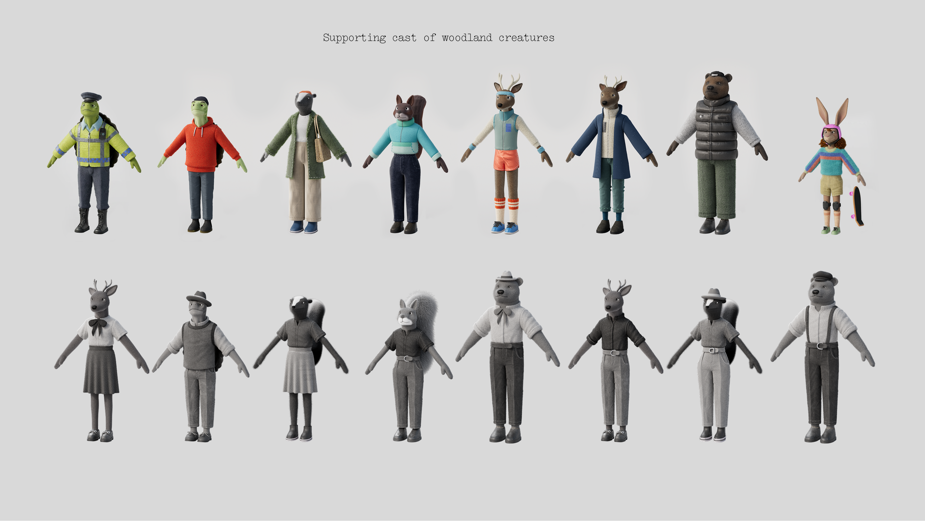 With the huge passage of time in our story, our characters Tori and Harold required multiple wardrobe changes for different times of day, seasons and occasions. In addition to the main cast, we populated the world with modern-day versions of woodland characters along with their century-old counterparts.