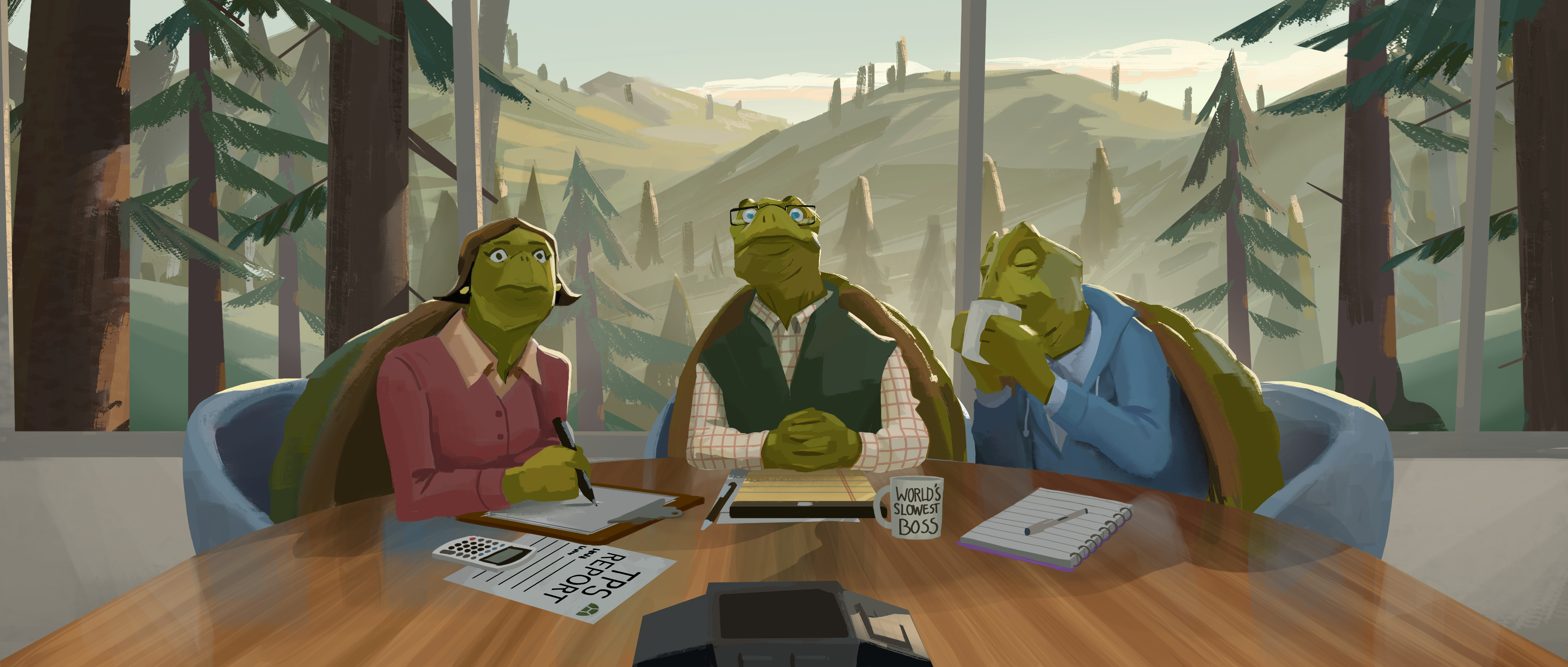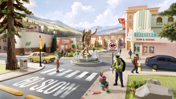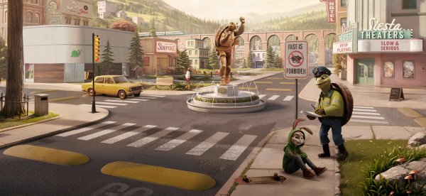 Before we dove into building anything, we spent time dreaming, designing, and problem solving how the environment would look and how it would all fit together to tell the story. The following concept art frames capture not only layout but mood, lighting, and color for Tortoise town.