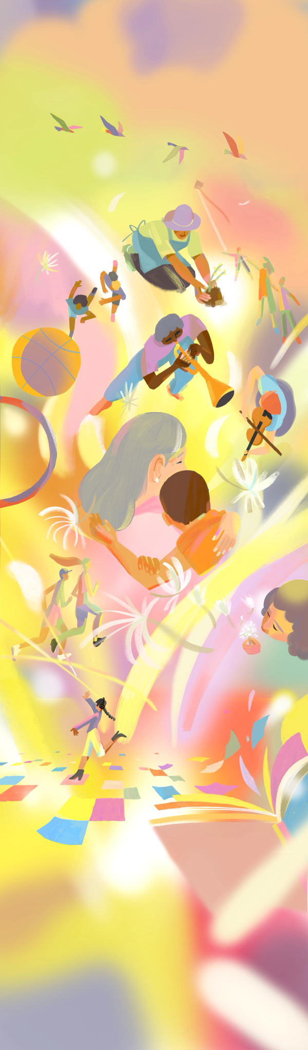 Using a painterly style to capture a feeling of personal expression, we go from tentative muted tones to a more lively and rich palette as the piece builds to echo the story progression.