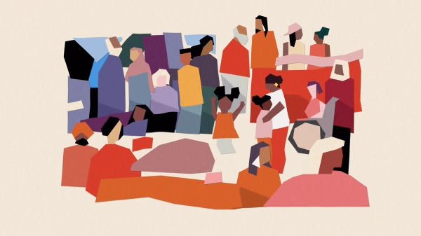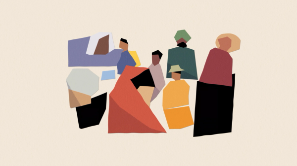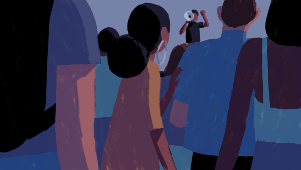 The ending culminates with our characters joining a crowd that simplifies and unifies into one last image.