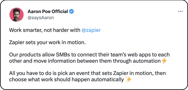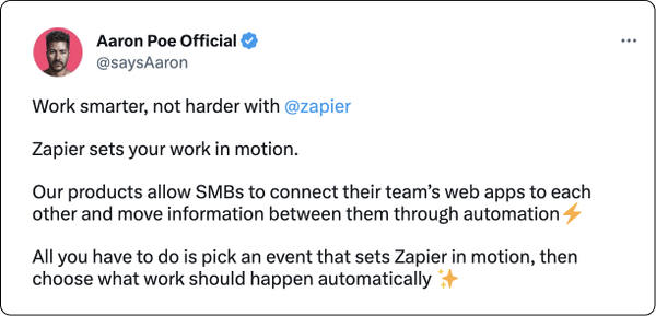 Know that overwhelming feeling of staring at a daunting list of tasks? Zapier automates mundane tasks, freeing up your headspace for bigger things.