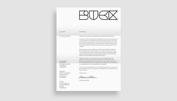Our new wordmark builds on the equity of our brand and our history. Speaking to the idea of a collective, different shapes representing different perspectives and expertises come together to make a whole. Inspired by our namesake, Buckminster Fuller, and his approach to systematic design, each individual letter is based upon a common architecture.