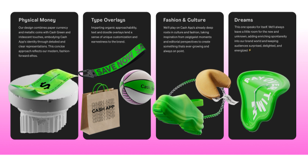 Lastly, to maintain consistency as the brand grew and evolved, we established detailed 3D brand guidelines, ensuring that the spirit of Cash App would shine through in every visual touchpoint.