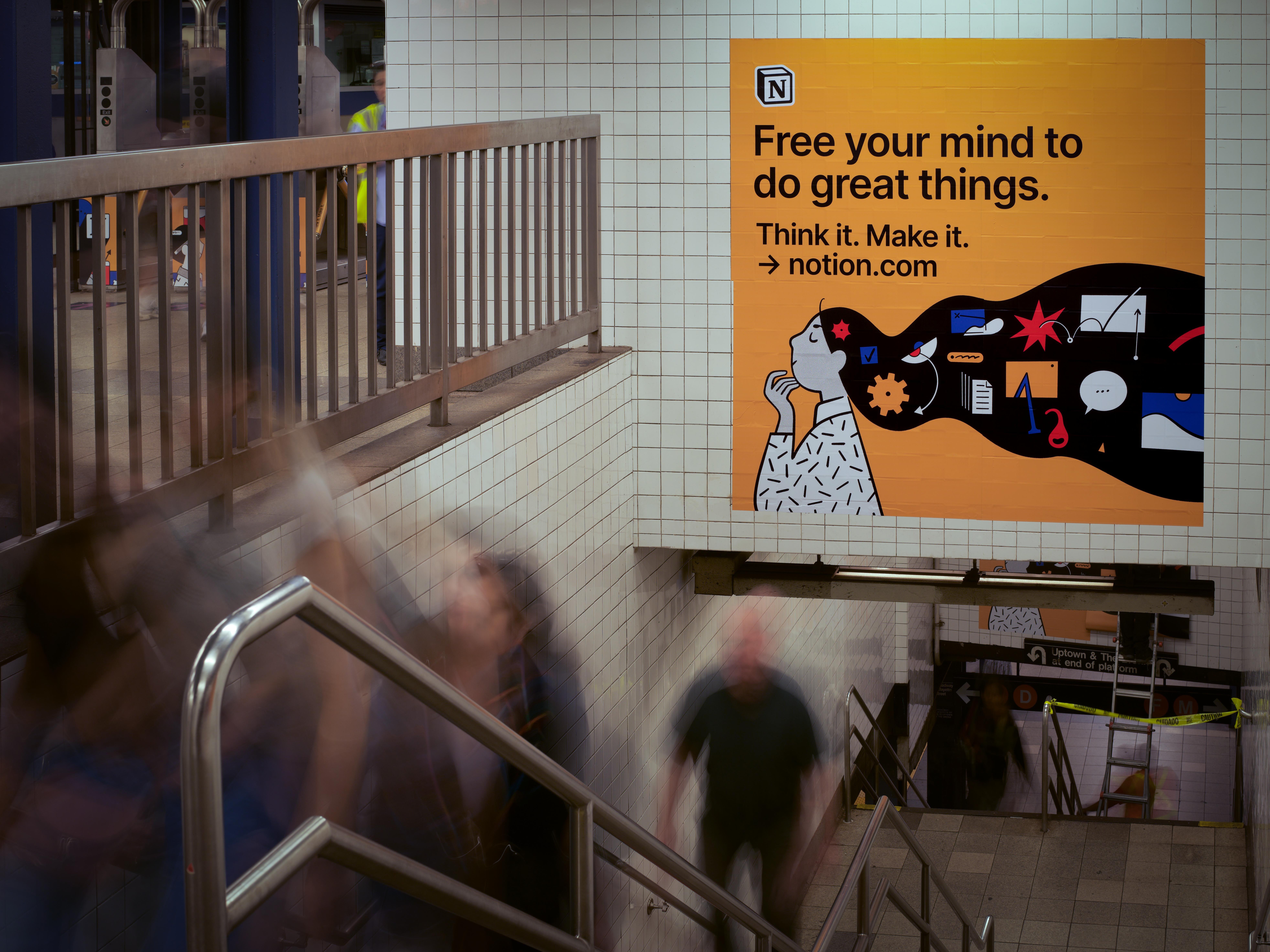 ...a new conceptual foundation for Notion’s OOH illustrations that allowed for (and celebrated!) primary colors, showed close-up profiles of people thinking, and stayed away from literal representations of interfaces...