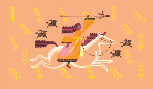 I'm inspired by the storytelling found in a lot of Native American paintings, as well as the decorative patterns used in day-to-day objects like woven baskets and clothing. I tried to marry those two ideas in this illustration while playing with my own favorite tools.